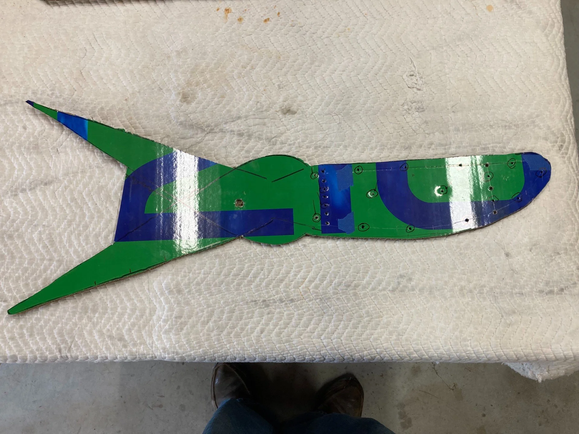 Had picked up a 43” flat screen for the hangar a while back and had saved the container it came in. The box provided large pieces of firm Coated cardboard to make templates of the hor. stab and chart elevator travel up & down . Traced the outline of the hor. stab with elevator in full UP andDOWN position. Then while still held in place , MARKED the locations of the existing rivets and the elv. hinge / pin by pressing cardboard ,( coated side towards the plane ) , against them. Rivets make nice Dimples, hinge pin leaves a small hole at it’s location. Cut it out and , good to go.